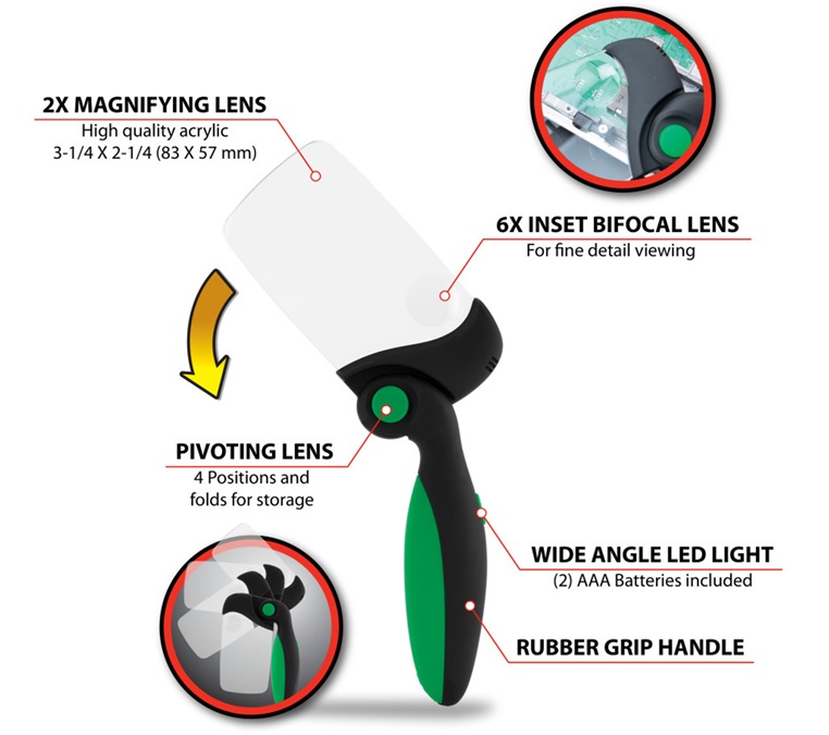 5.Large 2X magnifying area and 6X inset bifocal lens for fine detail